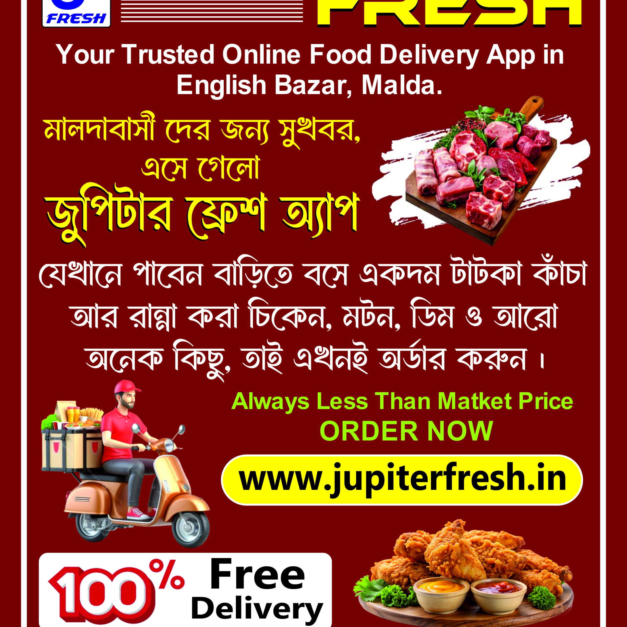মালদায় এই প্রথম এসে গেল “জুপিটার ফ্রেশ” অ্যাপ । এখানে সবধরনের আমিষ ও নিরামিষ আইটেম (রান্না করা ও কাঁচা) ঘরে বসে সুলভ মূল্যে ডেলিভারি পাবেন। (100% Free Delivery )